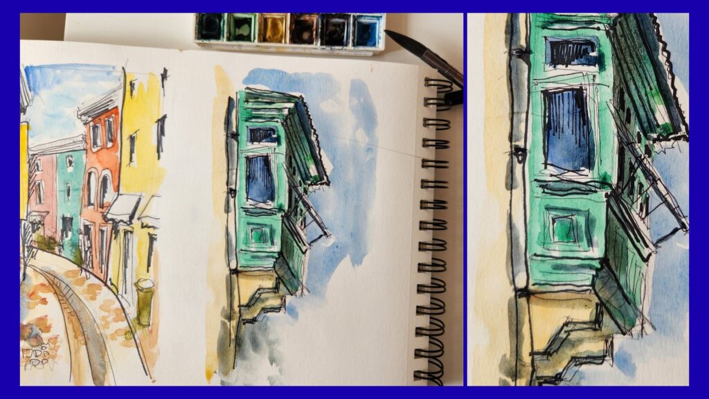 Carnet de vacances aquarelle: un balcon à Malte